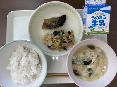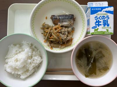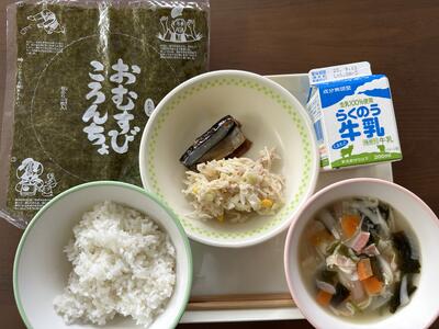 今日のメニューは、セルフおにぎり、わかめスープ、サンマのしょうが煮、ストックサラダ、牛乳でした。
