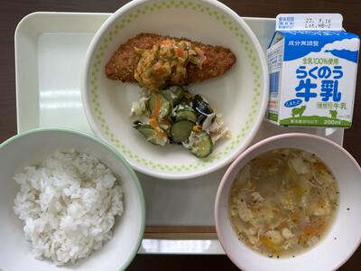 今日のメニューは、麦ごはん、たまごスープ、ホキフライのオーロラソースかけ、ごまだれ、牛乳でした。