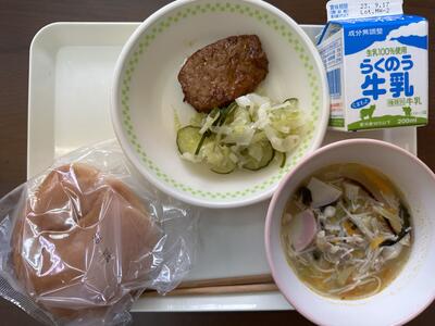 今日のメニューは、まるパン、野菜スープ煮、うさぎ型ハンバーグ、スパゲティサラダ、牛乳でした。