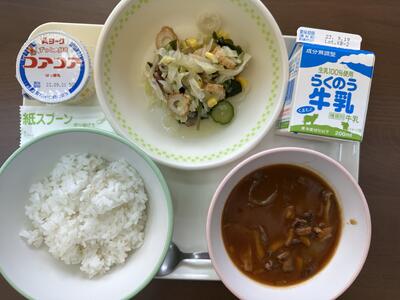 今日のメニューは、瞳きらきらカレー、ビタミンサラダ、牛乳でした。