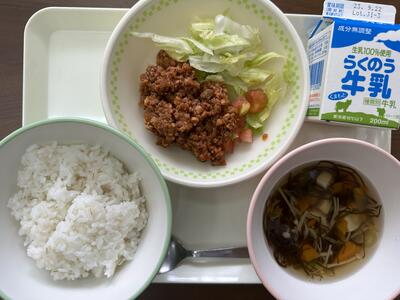 配膳では「麦ごはん、タコライスの具、レタス、トマト」が別々にありましたが、ご飯に具、レタス、トマトをのせて、セルフタコライスになりました。タコライスはメキシコ料理のタコスをごはんにのせた沖縄料理ですが、レタスやトマトの歯ごたえと、タコスの具の肉感、香辛料感(給食なので少ないですが)がとてもさわやかかつ濃厚でよかったです。今日もおいしくいただきました。