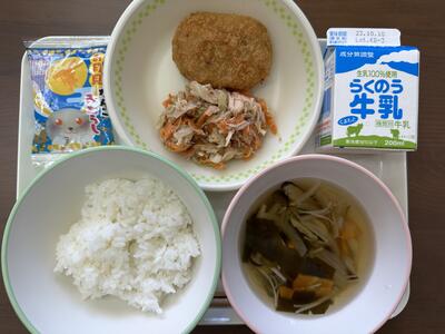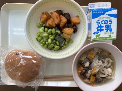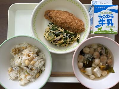 今日のメニューは、ご飯、はんぺん汁、大豆と豆腐のフライ、ひじきと切り堀大根の和え物、牛乳でした。