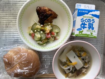 今日は熊本産小麦のパン、イタリア風サラダ、中華風スープにインド料理のタンドリーチキンと、国際色豊かなメニューでした。タンドリーチキンは、ヨーグルト、カレー粉、ケチャップ、ソースからなる調味液に鶏肉を漬け込んで焼いてありました。今日もおいしくいただきました。
