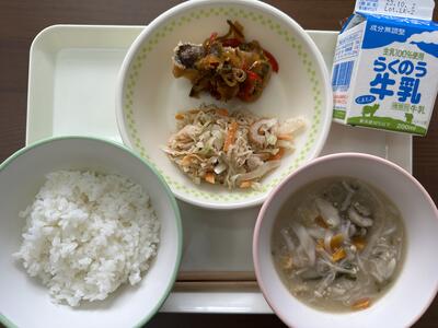 今日のメニューは、ミルクパン、千切り野菜のスープ、いわしのトマト煮、ツナサラダ、牛乳でした。