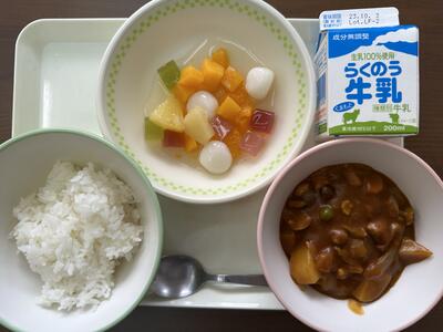 今日のメニューは、きのこカレー、フルーツポンチ、牛乳でした。