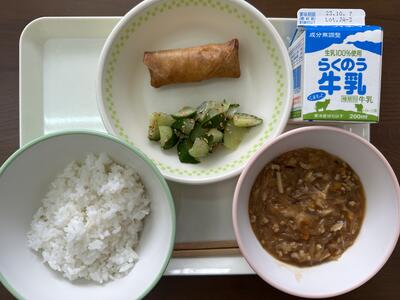今日のメニューは、麦ごはん、マーボー春雨、パリパリ春巻き、ごまきゅうり、牛乳でした。