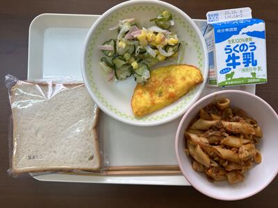 今日のメニューは、食パン、ボローニャ風パスタ、トマトオムレツ、コーンサラダ、牛乳でした。