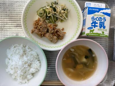 今日のメニューは、麦ごはん、中華スープ、ほうれん草シューマイ、チャプチェ、牛乳でした。