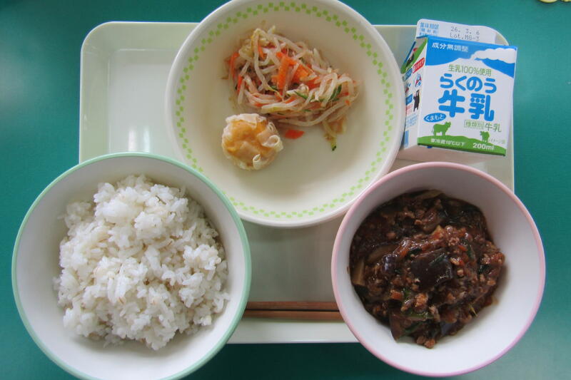 今日は、なすとひき肉がたっぷり入ったマーボーなすでした。なすの紫はポルフェノールの一種のナスリンという成分だそうです。ブルーベリーと同様に、視力の回復を助ける効果が期待されるそうです。そのほかにも食物繊維が豊富なので、腸内環境を整えるのにもよい食品だそうです。子どもたちは、なすが苦手をいう子どもも多いです。しかし、体にいいことが多いなすなので、しっかり食べて、元気に過ごしてほしいものだと思います。