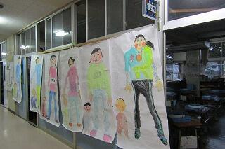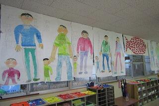 赤ちゃんのときの自分の大きさと、現在の自分の等身大の絵を描いています。みんな、大きくなったね。