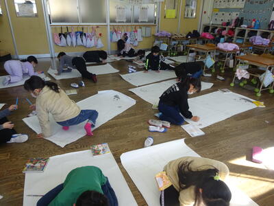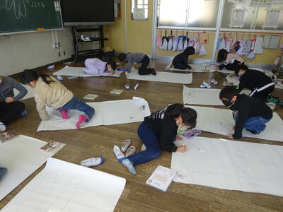それぞれ自分の等身大の絵を、赤ちゃんの時の絵の大きさと比べました。