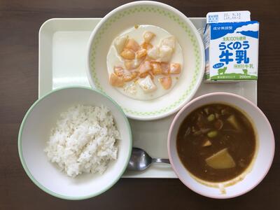 今日のメニューは、カレーライス、フルーツヨーグルト、牛乳でした。
