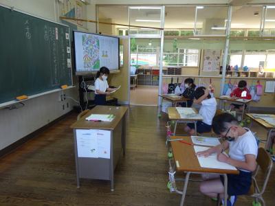 「迷子のお知らせマスターになろう」というめあてで、友だちの発言を基に、迷子になっている人はだれなのか、メモをとりながら考えるという活動を行いました。