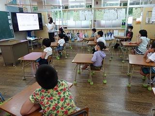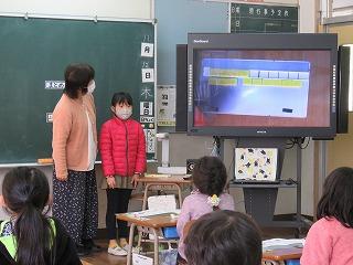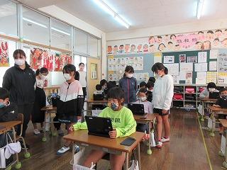 1,2年生の子どもたちのために、5年生がタブレットPCの使い方を教えに来てくれました。