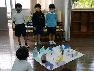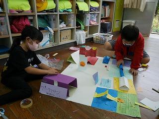 3人グループで、色画用紙を折って様々な世界を表現しました。