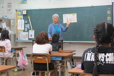 次に、松永欣子さんから、自分が小学生だった頃の戦争体験の話に加えて、対馬丸沈没や広島の建物疎開での被害者に、四小の児童と同世代の子どもたちがたくさんいたことを教えていただきました。