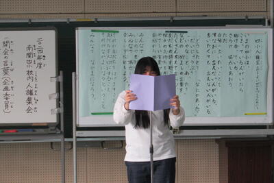 その後、各学年で取り組んだ人権学習の紹介アナウンスの後、学年代表による発表を聞きました。そして、希望者によるお返しの発表が続きました。