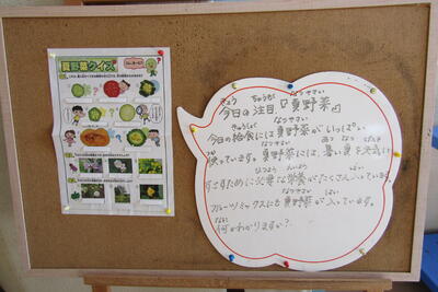 今日の注目は「夏野菜」です。今日の給食には夏野菜がいっぱい使われています。夏野菜には、暑い夏を元気に過ごすために必要な栄養がたくさん入っています。フルーツミックスにも夏野菜が入っていました。