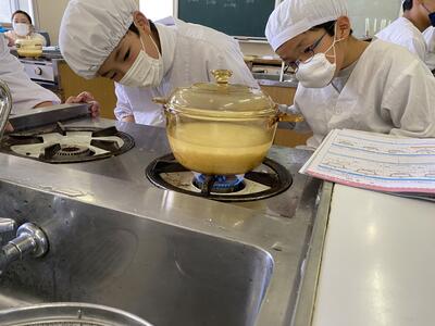 手順や火加減をよく確認し、鍋の中の様子をよく観察して火を調節しました。すこし焦げてしまった班もありましたが、できたご飯をおいしくいただきました。