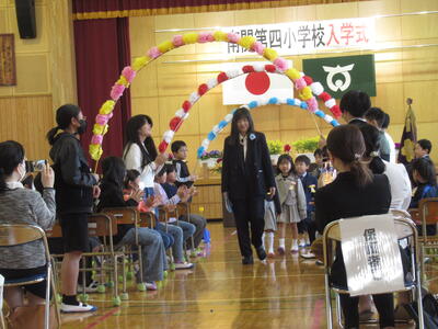 今年度は、8名の新入生が南関第四小学校にやってきました。卒業式同様、2年生から6年生が全員式に参加し、新入生を迎えました。