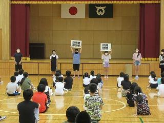 四小集会(企画委員会) 投稿日時 : 2020/07/03 学校サイト管理者 6月30日(火)の四小集会は、企画委員会の発表でした。 よりよいあいさつの仕方について、お手本を見せてくれました。 きれいなくつならべの様子を、写真で見せてくれました。 また、ソーシャルディスタンスを保つために、段ボールとスズランテープで仕切りを作りました。 よりよい学校生活を送るために、様々なアイデアを発表しました。 仕切りは、さっそく廊下に設置しました。