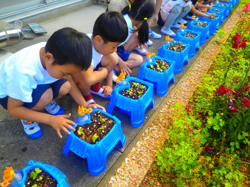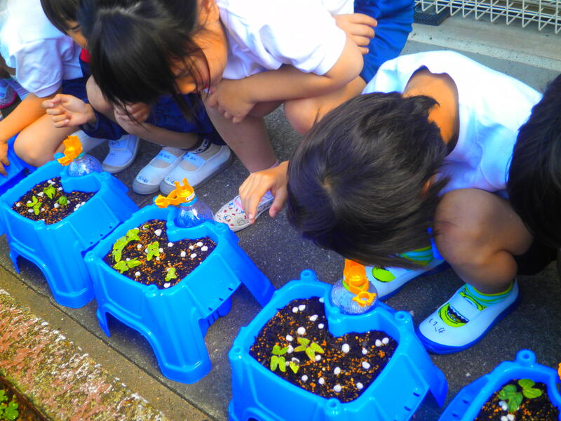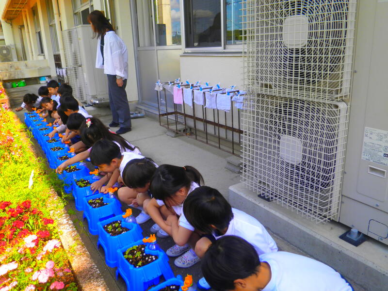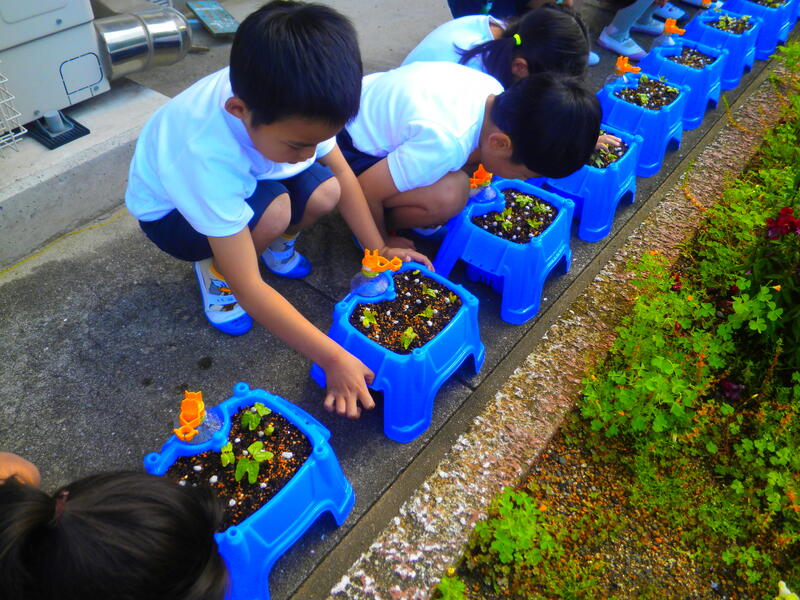 4月25日(金)の授業参観の時に、保護者の方と一緒に植えたアサガオの芽が5月7日(木)頃から出はじめて、すくすく育っています。子どもたちは、アサガオの生長が嬉しくてなまらないようで、水かけ等のお世話を頑張っています。花が咲き、種が実るまで、大事に育てていくと思います。植物を育てていく中で、自然や生き物を育てることの楽しさと大切さ(命の大切さ)を学んでいくと思います。