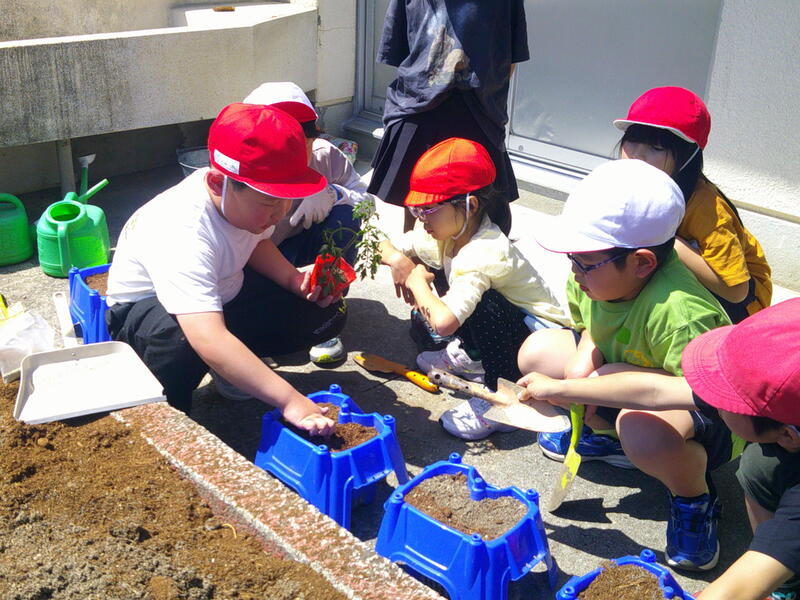 5月13日(火)に、野菜の苗を学級園に植えました。きゅうり、なすび、おくら、小玉すいかなどを植えました。また、自分の植木鉢には、一人1本、ミニトマトの苗を植えました。しっかりお世話をして、たくさんの実がついて、収穫の楽しさを味わうことができたらと思います。水かけを頑張ってしっかり苗が根付くといいなあと思っています。