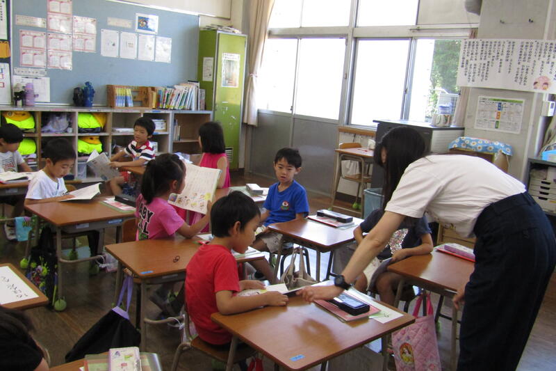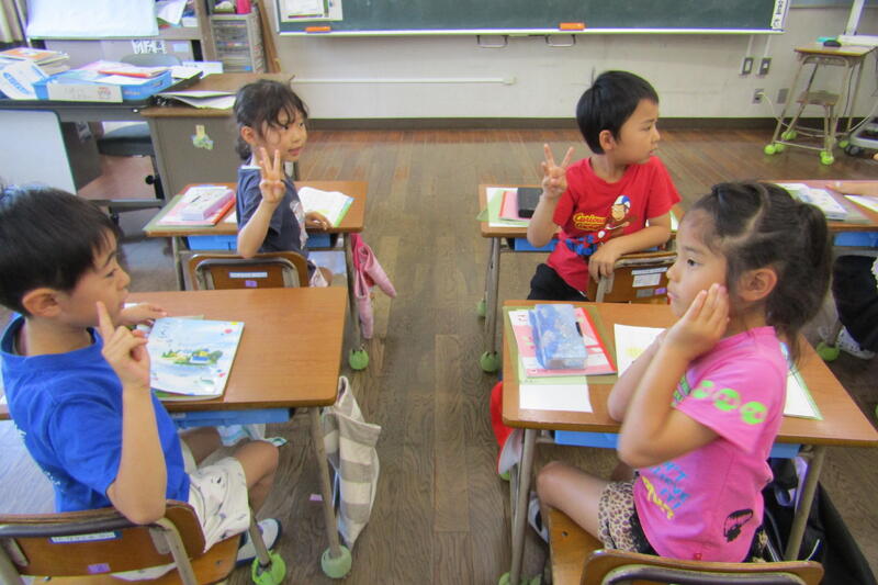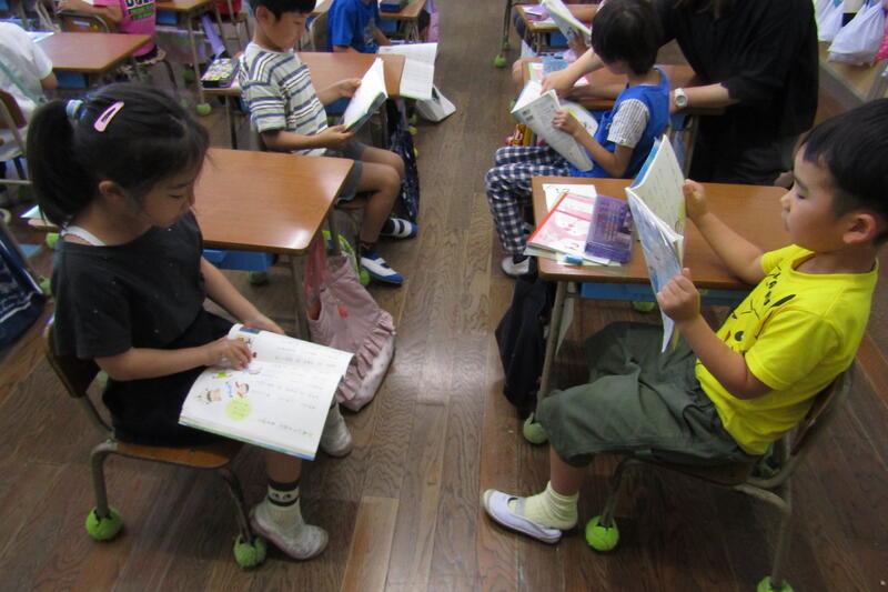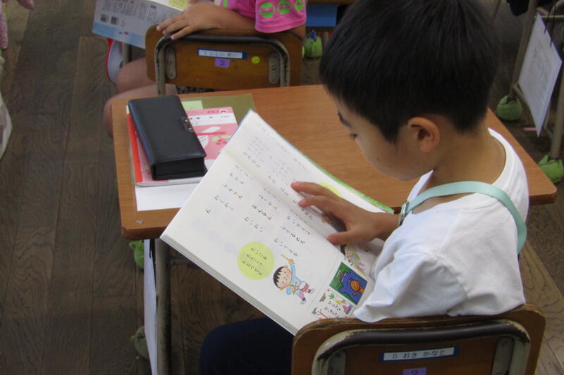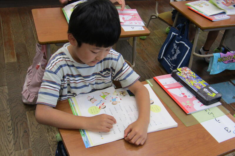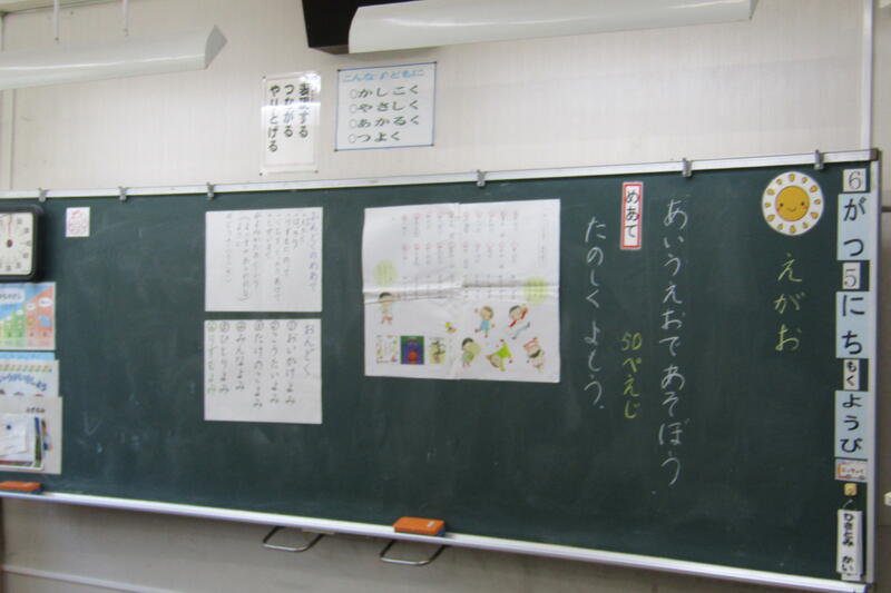 今日の国語は「あいうえおであそぼう」でした。教科書の文章をいろいろな読み方で読みました。先生と「追いかけ読み」をしたり、ペアの友だちと「こうたい読み」をしたりしました。読み方をかえ、繰り返し何度も音読し、リズムよく、すらすら読めるように練習しました。学習内容に変化を持たせて、子どもたちが楽しみながら、集中して音読を繰り返し読めるような学習活動でした。きっと、昨日よりもすらすらと、はっきりと読めるようになったと思います。手で文を押さえて確認して読む子、ゆっくり文字を確認しながら読む子、すらすらと何度もリズムよく読む子、読む速度はまだそれぞれ違いますが、みんな一生懸命に「すらすらとはっきりと読む」ことを目標に頑張っていました。1年生の頑張る姿が素敵でした。