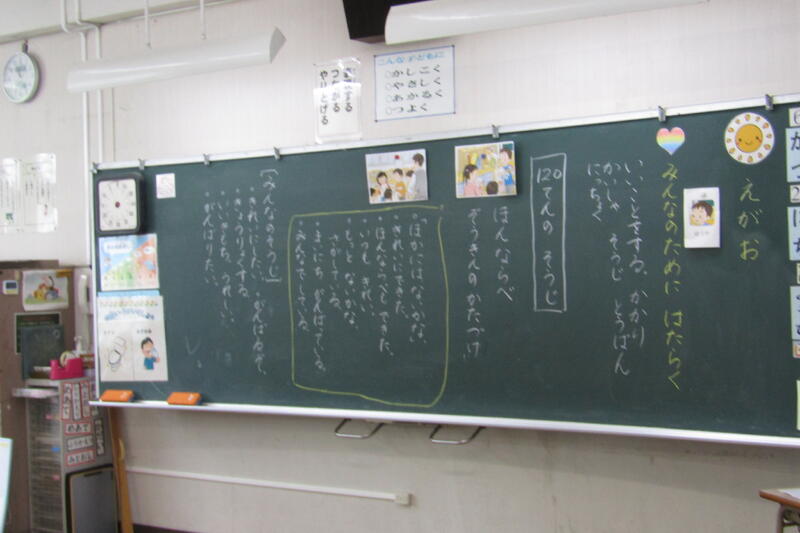 道徳の時間に「働く」ことについて考えました。学校のそうじをするときの様子を思い出したり、きれいになった教室を見て思ったことを発表したりしました。掃除をしてきれいになると嬉しいこと。よい気分になること。働くと友だちや家族も嬉しい気分になること。などの意見がでました。「働く」ことのよさをみんなで共有する時間になりました。ひらがなもずいぶん覚えて、ノートに自分の考えを書くことができるようになっています。3か月間の成長のすばらしさを感じました。1年生、がんばっていますね。