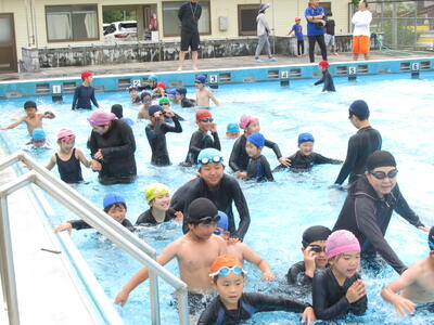 しっかり準備運動をした後は、水慣れをしてプールに入りました。1・2年生の子どもたちは5・6年生とペアを組み、みんなで一緒に渦を作って楽しみました。