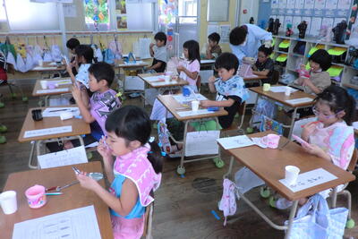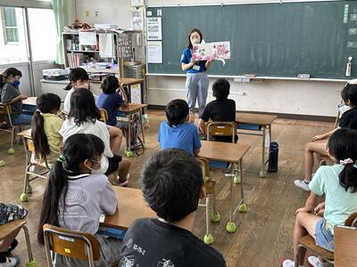 7月12日(水)、朝からクローバーさんによる読み聞かせがありました。今日は、村山さん、前田さん、松本さん、大里さん、松永さん、打越さんでした。