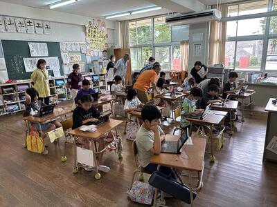 各学級を回って子どもたちの学習の様子をご覧いただきましたが、1人1台タブレットの活用や、掲示物の様子、子どもたちの頑張り等、たくさん褒めていただきました。