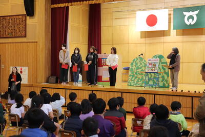 11月15日朝から、体育館に全校児童が集まって、秋のスペシャルお話会がありました。いつも読み聞かせをしてくださるクローバーの会から、松本さん、前田さん、関さん、打越さん、萩尾さん、田畑さん、伊藤さんが来てくださいました。