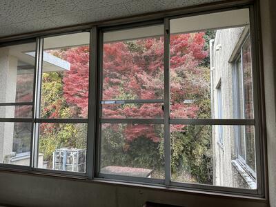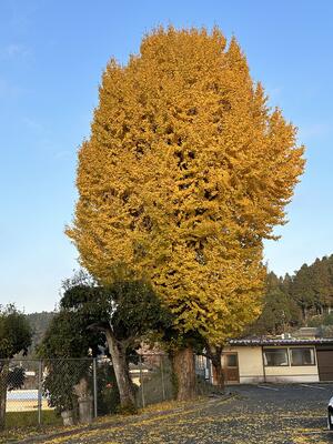 南関四小の校地には、たくさんの落葉樹があります。桜のように早いものはもうすっかり裸木ですが、今は県道から見えるイチョウの巨木と校舎裏の斜面の紅葉が晩秋と初冬の端境期を彩っています。