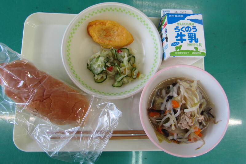 9月3日(水)の給食は、クイティオスープ、ミルクパン、トマトオムレツ、じゃこサラダ、牛乳でした。