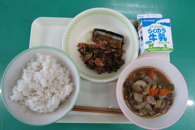 9月4日(木) 本日の給食は、麦ご飯、夏のっぺ汁、さんまの甘露煮、茎わかめのゴマ炒め、牛乳でした。