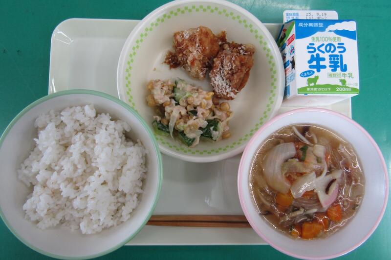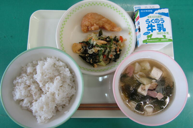 9月9日(火) 本日の給食は、麦ご飯、チンゲンサイのスープ、ささ身のレモン漬け、ちぐさあえ、牛乳でした。