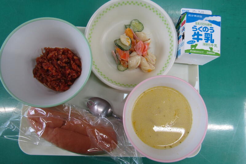 9月10日(水) 本日の給食は、コッペパン、コーンスープ、チリコンカン、マカロニサラダ、牛乳でした。