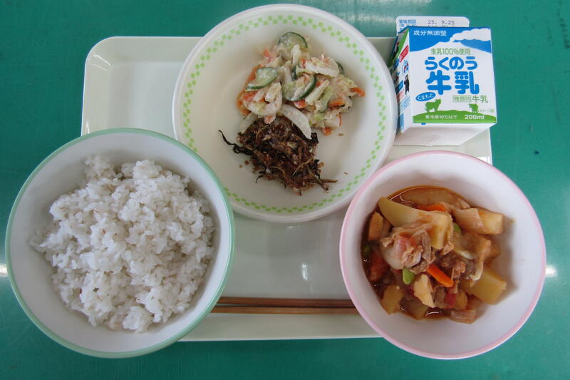 9月11日(木) 本日の給食は、麦ご飯、トマト入り肉じゃが、ごまネーズサラダ、手作りふりかけ、牛乳でした。