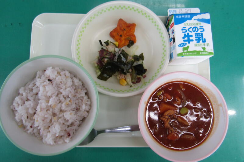 9月12日(金) 本日の給食は、古代ごはん、ハヤシルー、五目しんじょ、カイソウサラダ、牛乳でした。