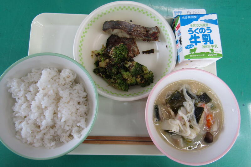 9月16日(火) 本日の給食は、麦ご飯、里芋のみそ汁、ホキのハーブ焼き、ブロッコリーの佃煮和え、牛乳でした。