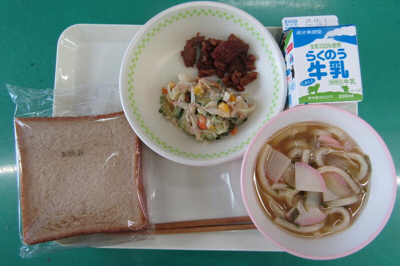 9月17日(水) 本日の給食は、こくとうパン、ソーキそば、豚肉の甘辛煮、ゴーヤサラダ、牛乳でした。