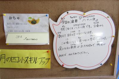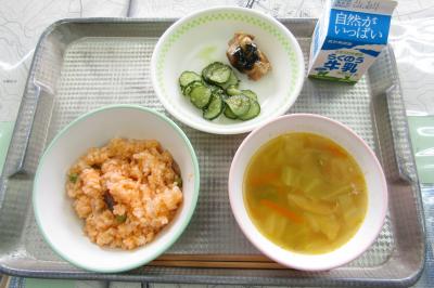 そこで、今日のメニューは、牛乳、チキンライス、コンソメスープ、鶏肉のお茶ソースかけ、ごまきゅうりでした。なるほど、鶏肉にかかっていたソースは、お茶を使った「お茶ソース」だったのですね。たいへんおいしくいただきました。