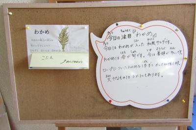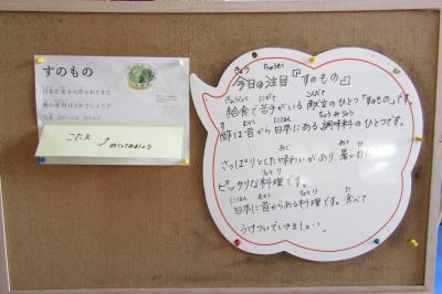 給食では、いろいろな味の和え物が出されます。醤油、酢、砂糖、油を入れることが多いですが、今日は、それに「味噌」が入っていました。味噌には、お腹の中にある悪玉菌をやっつけ、病気にかかりにくくする働きがあるからです。毎日食べてほしい食材の一つです。