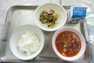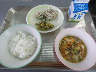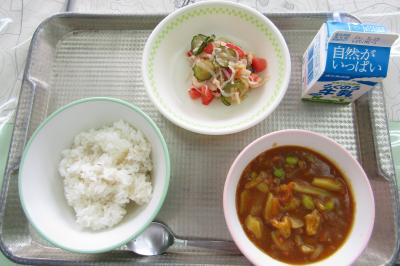 今日のメニューは、南関あげのカレー、麦ご飯、牛乳、節そうめんサラダでした。