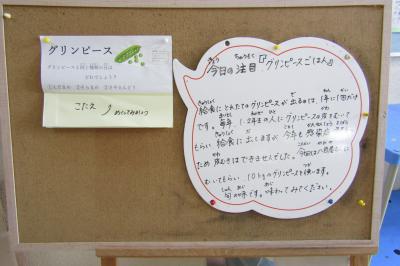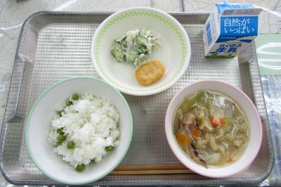 今日のメニューは、グリンピースごはん、牛乳、季節のみそ汁、チキンナゲット、ポテトサラダでした。例年、1・2年生にグリンピースの皮をむいてもらい、給食に出しているそうですが、感染症予防のため、皮むきはできませんでした。今回は、八百屋さんにむいてもらって、10㎏のグリンピースを使ってあります。春らしい香りのグリンピースごはんでした。また、季節のみそ汁には、南関揚げも入っていました。たいへんおいしくいただきました。