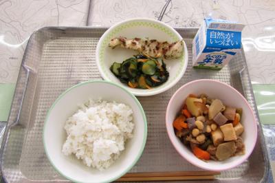 今日のメニューは、麦ご飯、牛乳、大豆五目煮、ちくわの磯辺揚げ、きゅうりの酢の物でした。