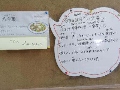 今日は中華料理「八宝菜」です。中国語で「八」は「八種類」の食材を使うことでなく、たくさんのという意味があります。今日も野菜やたまご・肉・きのこなどいろいろな食材が入っています。また中国では旧正月を祝う料理「八宝飯」など「八宝」は縁起の良いとして料理名に使われています。今日の南関食材は、南関米、たまねぎ、キャベツです。
