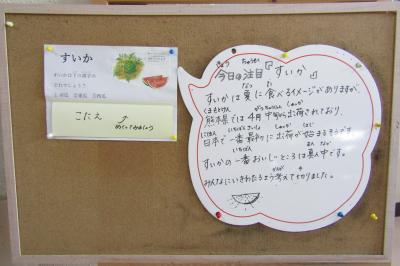 すいかは「西瓜」と書きます。夏に食べるイメージがありますが、熊本県では、4月中旬から出荷されており、日本で一番最初に出荷が始まるそうです。すいかの一番おいしいところは、真ん中です。そこで、今日のすいかは、一番おいしいところがみんなにいきわたるように工夫して切ってありました。甘くておいしいすいかでした。