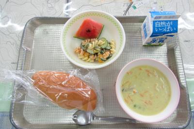 今日のメニューは、コッペパン、牛乳、グリーンシチュー、マカロニサラダ、すいかでした。